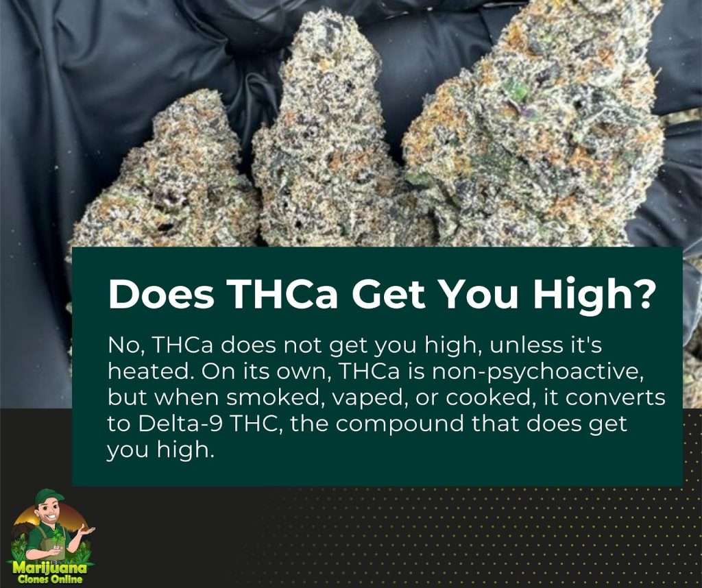 No, THCa does not get you high, unless it’s heated by smoking or decarbing, just like recreational cannabis. On its own, THCa is non-psychoactive, but when smoked, vaped, or cooked, it converts to Delta-9 THC, the compound that does get you high. This makes THCa flower legal yet potent when used in a certain way.